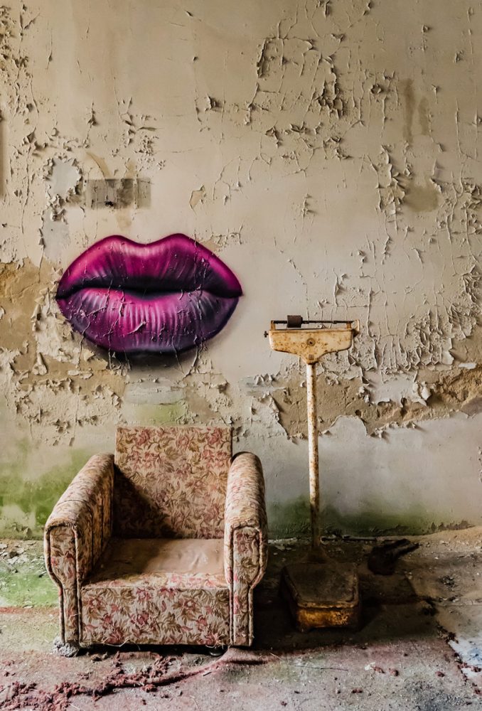 Georgia Ortner Photography luogo perduto Divano singolo e vecchia bilancia di fronte a un muro diroccato con una bocca da bacio viola