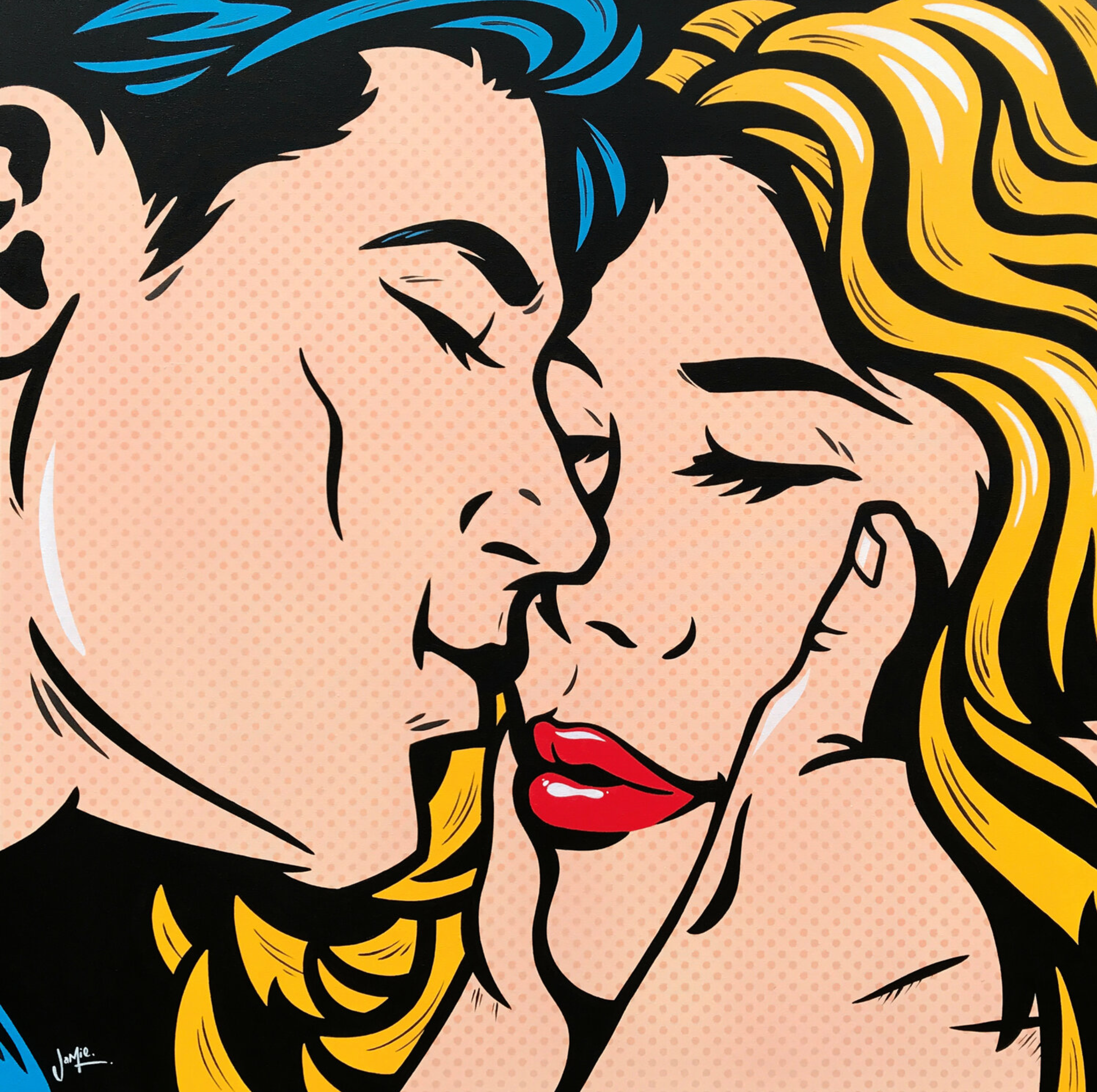 Artista:Tecnica:Acrilico su telaMateriale:Olio | TelaInformazioni sull'opera d'arte:Coppia Pop Art. Una giovane coppia di innamorati attende il primo bacio mentre lui le tiene delicatamente il viso. Quadro pop art in stile fumetto dal design originale. Le pagine sono dipinte di nero e possono essere appese direttamente alla parete o alla cornice.Formato: