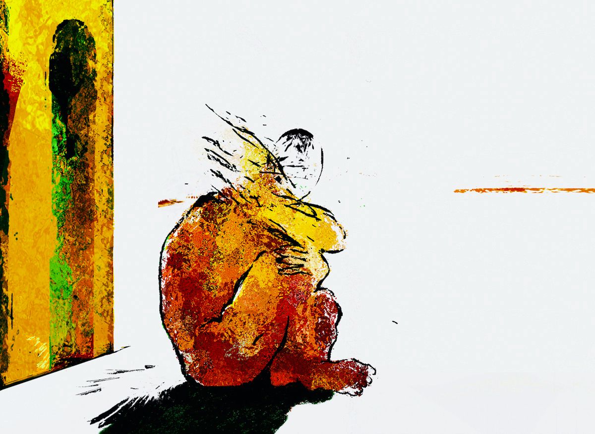 Klaus Heckhoff pittura astratta illustrazione corpo seduto davanti a tela gialla