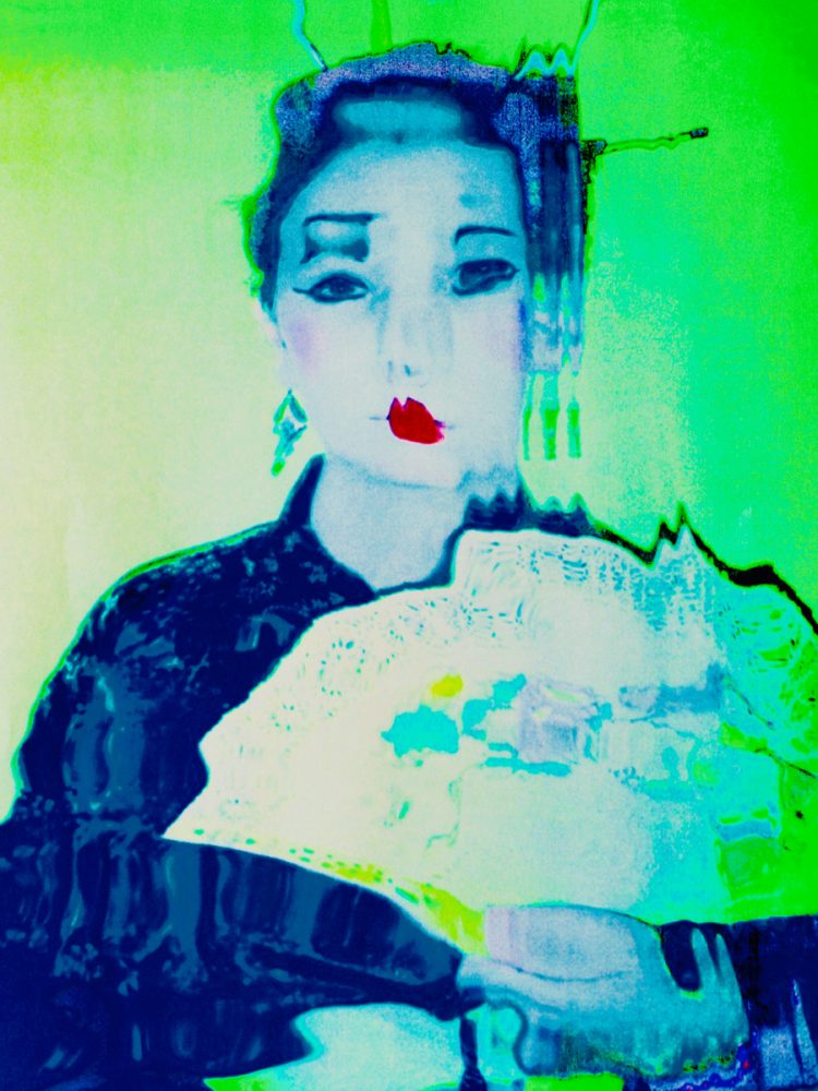 Manfred Vogelsänger fotografia analogica astratta donna asiatica con ventaglio e volto distorto al neon