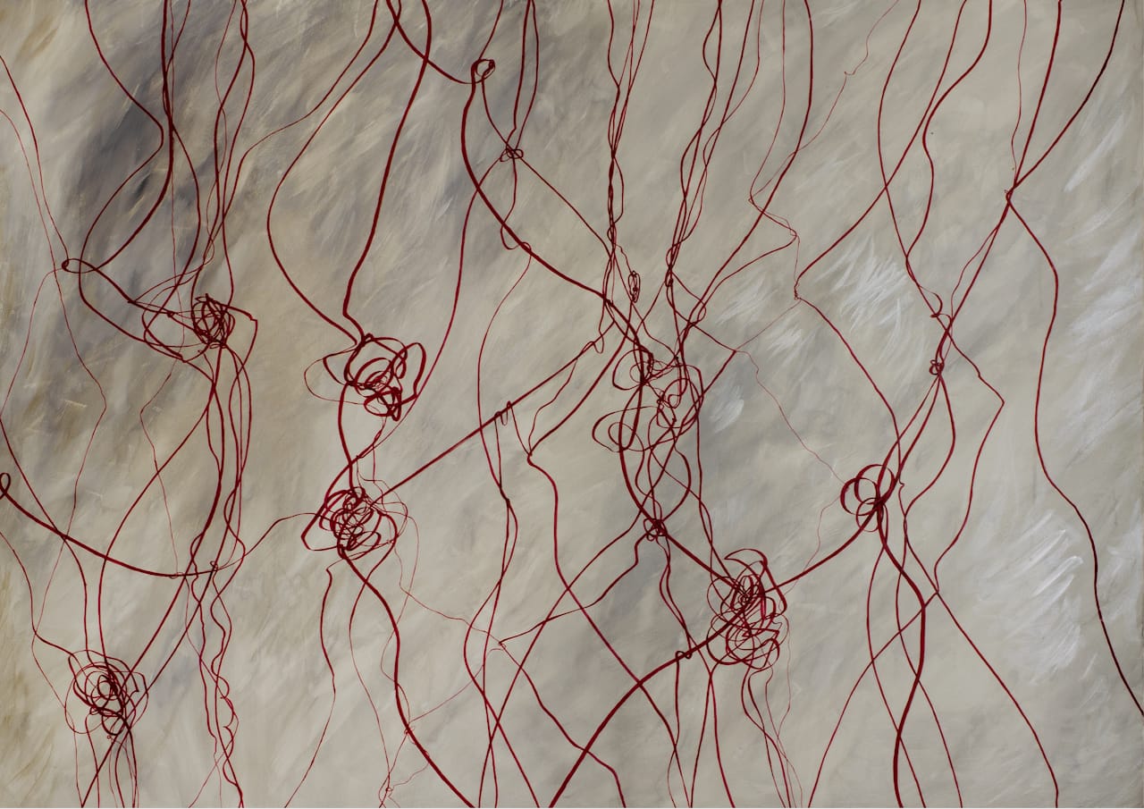 Maria Pia Pascoli pittura astratta linee e ghirigori rossi filo conduttore