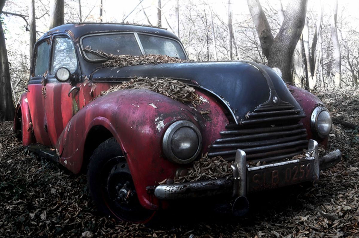 Martina Chardin Fotografia vecchia auto d'epoca rossa abbandonata nella foresta
