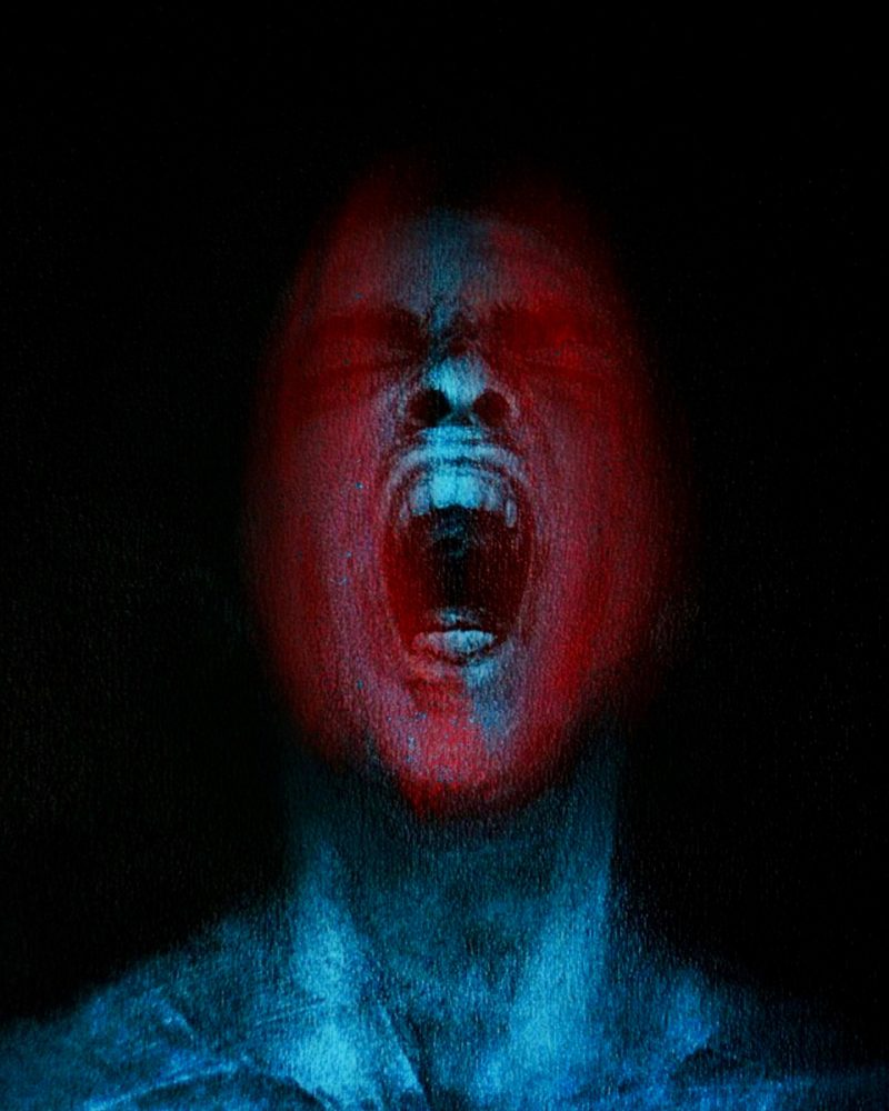 Zoko disegno digitale ritratto astratto uomo urlante in blu con vernice rossa sul viso